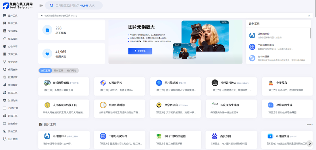 免费在线工具网,https://tool.9eip.com/ 专注于收集一些免费的在线工具,不免费不收录,更新快,想要的功能这里一般都能找到。